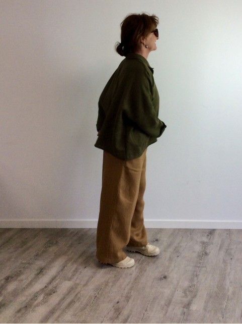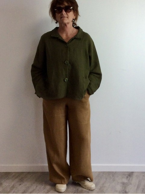 Combinaison en lin, près du corps, arrivant à mi-mollet, à porter seule ou avec un t-shirt ou un chemisier Jambes larges, effet jupe culotte.