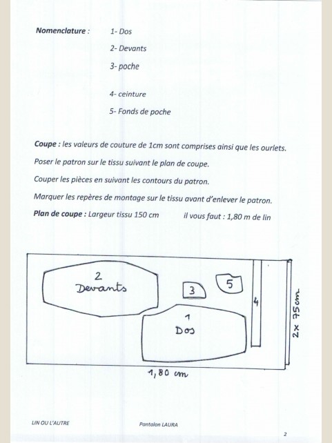 Patron combinaison Eugénie 2,0m de lin Tailles : XS S M L XL Plan et gamme de montage avec dessins techniques Grille de tailles